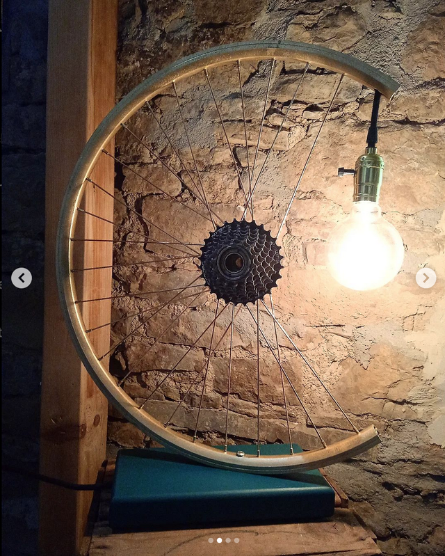 Lampe Roue de Vélo Upcycling doré mat, socle bois vert émeraude, douille interrupteur E27, ampoule LED non fournie